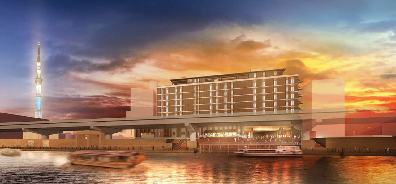 โดดเด่นตั้งแต่บริเวณด้านหน้าโรงแรมที่เชื่อมต่อโดยตรงกับแม่น้ำสุมิดะและท่าเรือ ดื่มด่ำกับบรรยากาศของสายน้ำได้จากระเบียงที่ออกแบบเป็นขั้นบันไดเลียบแม่น้ำสุมิดะและกำแพงกันคลื่นที่แผ่ขยายไปกว้างขวาง ทำให้เราสามารถนั่งเรือไปอาซากุสะและโอไดบะได้ อีกทั้งทางโรงแรมยังมี Night Cruise โปรแกรมล่องเรือยามค่ำคืนที่เราสามารถเพลิดเพลินไปกับการประดับไฟของโตเกียวสกายทรีและแม่น้ำสุมิดะ