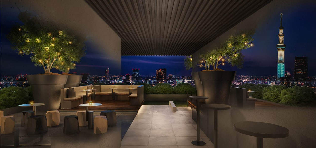 สัมผัสประสบการณ์ยามค่ำคืนอันหรูหราในกรุงโตเกียวที่รูฟท็อปบาร์ชั้นบนสุดของทางโรงแรม ซึ่งให้บริการสำหรับแขกเข้าพักเท่านั้น ระเบียงและเลานจ์ที่สามารถชมทิวทัศน์ยามค่ำคืนเหนือเมืองเรียวโกกุและแม่น้ำสุมิดะ