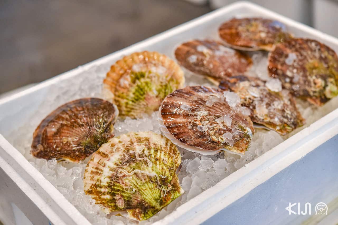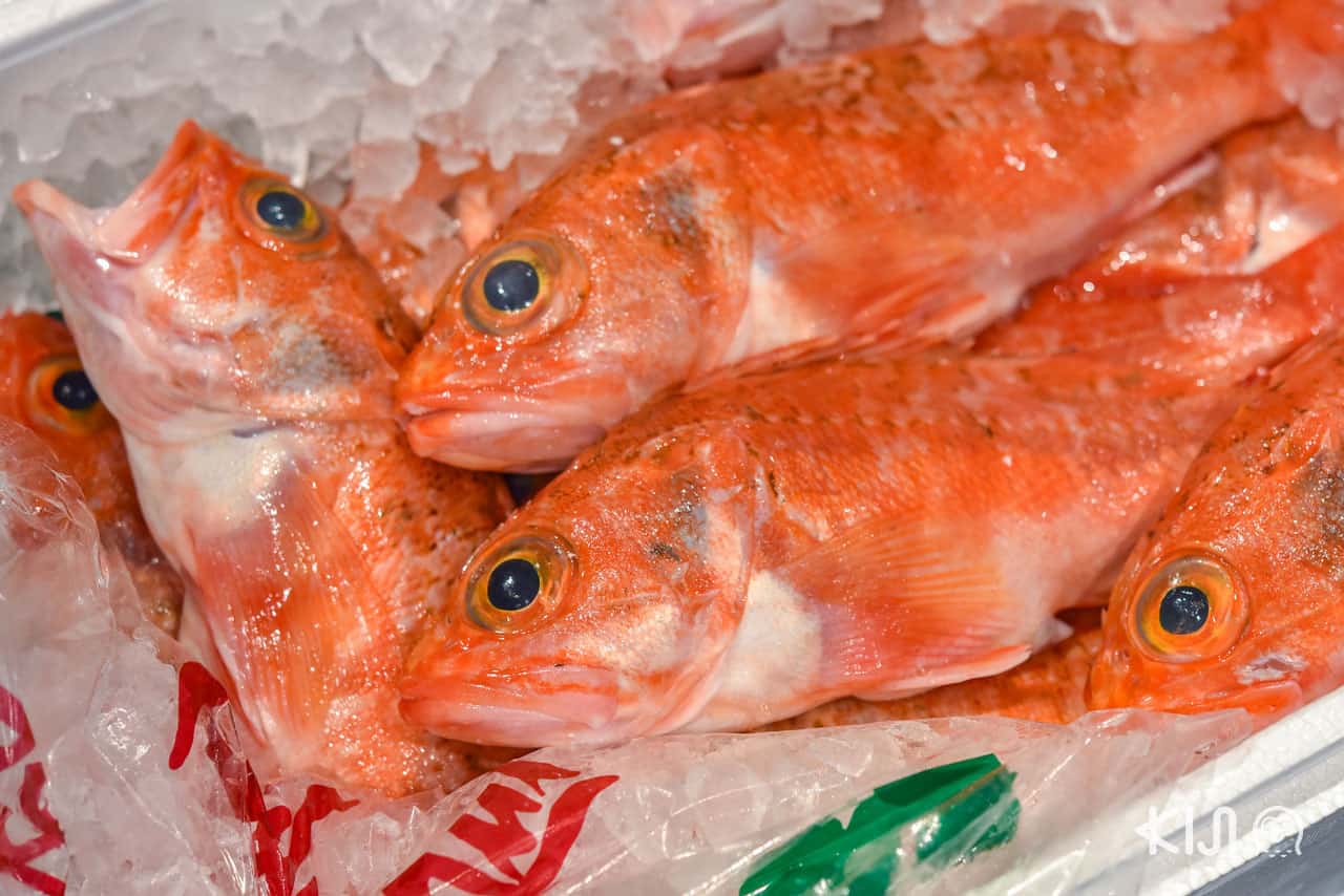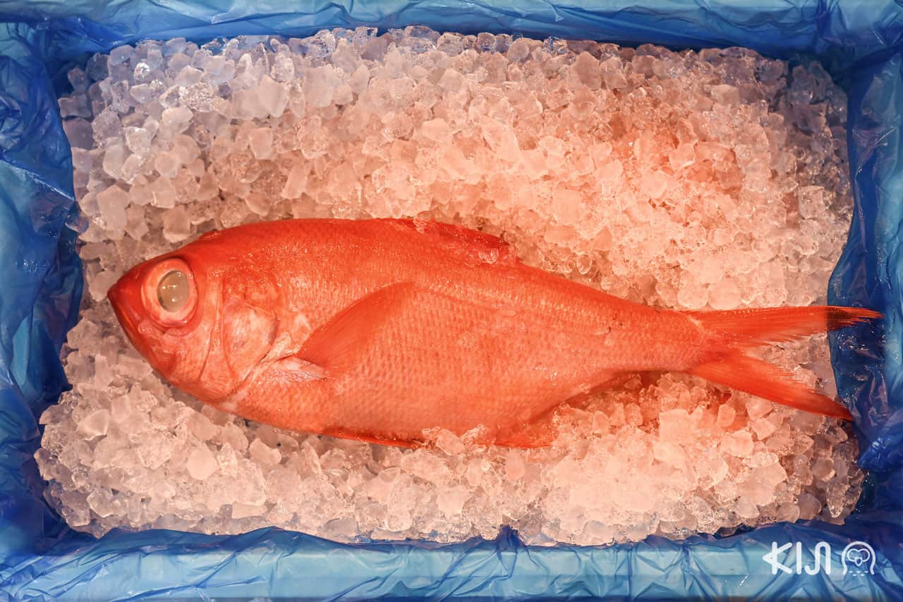 ข้ามมาดูโซนปลาและอาหารทะเลกันบ้าง ยกทะเลมาไว้ที่ตลาดกันแบบสดๆ ทั้งตัว ทั้งปลาโฮโบะหน้าตาตลกๆ ปลาซาบะ ปลาคินเมะได ปลาไหล ปูซูไว หอยเม่นสดๆ แบบยังไม่แกะเปลือก หอยเชลล์ตัวใหญ่เท่าฝ่ามือ หอยนางรม ไข่ปลาแซลมอนที่ยกขายกันเป็นกิโล และอาหารทะเลอื่นๆ อีกเพียบ ส่วนใครที่ขี้เกียจแล่ ขี้เกียจเข้าครัว ทางตลาดยังมีบริการแล่ปลาให้เรียบร้อยอีกด้วย
