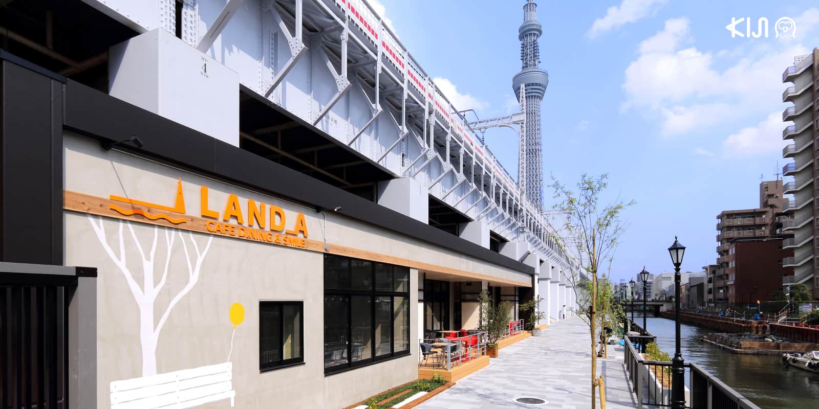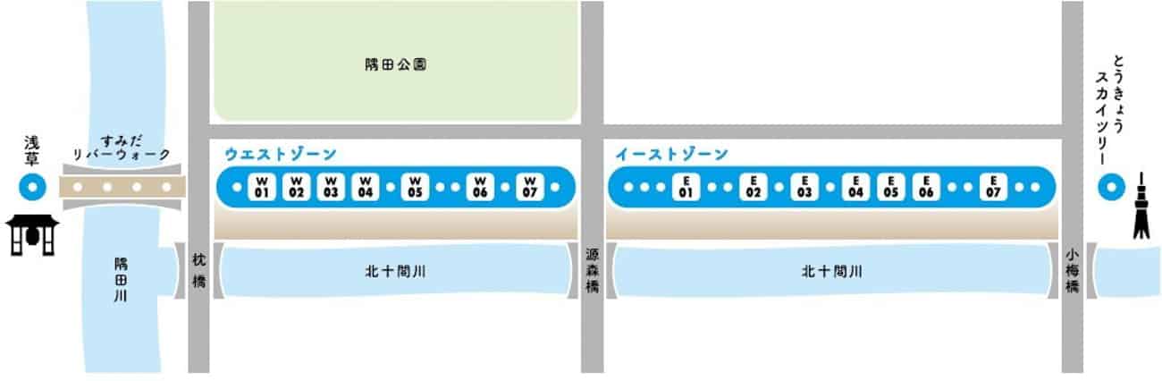 พื้นที่ริมน้ำที่ถูกปรับปรุงให้กลายเป็นจุดท่องเที่ยวน่ารื่นรมย์ในทุกๆ ฤดูกาล พบกับร้านค้าจำนวน 14 ร้านที่มีทั้งร้านอาหาร คาเฟ่ และเบเกอรี่ โดยแบ่งออกเป็น West Zone ทางฝั่งอาซากุสะ และ East Zone ทางฝั่งโตเกียวสกายทรีฒ