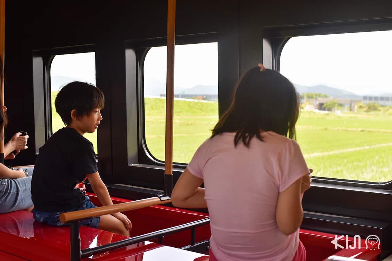 ภายในขบวนมีการตกแต่งอย่างประณีตสวยงาม เทียบกับบรรดา Joyful Train ด้วยกันก็มีเพียง Toreiyu Tsubasa ที่ลงดีเทลยันที่นั่ง นั่นก็คือการบุด้วยเสื่อทาทามิ ในฐานะที่เราเป็นผู้โดยสารเห็นแบบนี้แล้วก็ประทับใจ ว่าแล้วก็แชะภาพเก็บไว้เป็นที่ระลึกว่าครั้งหนึ่งเราเคยนั่งรถไฟที่สวยขนาดนี้มาแล้ว