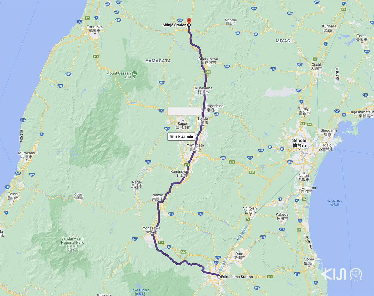 ระหว่างสถานีชินโจ (Shinjo Station) จังหวัดยามากาตะ (Yamagata) กับสถานีฟุกุชิมะ (Fukushima Station) จังหวัดฟุกุชิมะ (Fukushima)