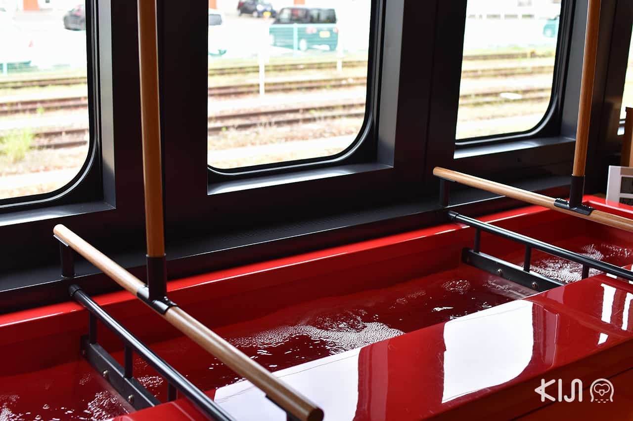 มาถึงไฮไลท์ของขบวนอย่างจุดแช่ออนเซ็นบ้าง ภายในบรรยากาศผ่อนคลายเป็นส่วนตัวด้วยระแนงไม้ช่วยพรางสายตา ส่วนตัวบ่อและที่นั่งสีแดงตั้งใจให้เราหันหน้าเข้าหาหน้าต่าง นัยว่าระหว่างแช่เท้า 15 นาทีต่อจากนี้ก็เชิญดื่มด่ำกับวิวริมทางได้เลยเต็มที่ไม่มีใครว่า ข้างๆ กันคือโซฟาที่เป็นงานฝีมือจากเมืองเทนโด ขณะที่ 1 รอบสามารถแช่พร้อมกันได้ราว 6 คน และมีค่าใช้จ่าย 450 เยน/คน (ไม่รวมภาษี)