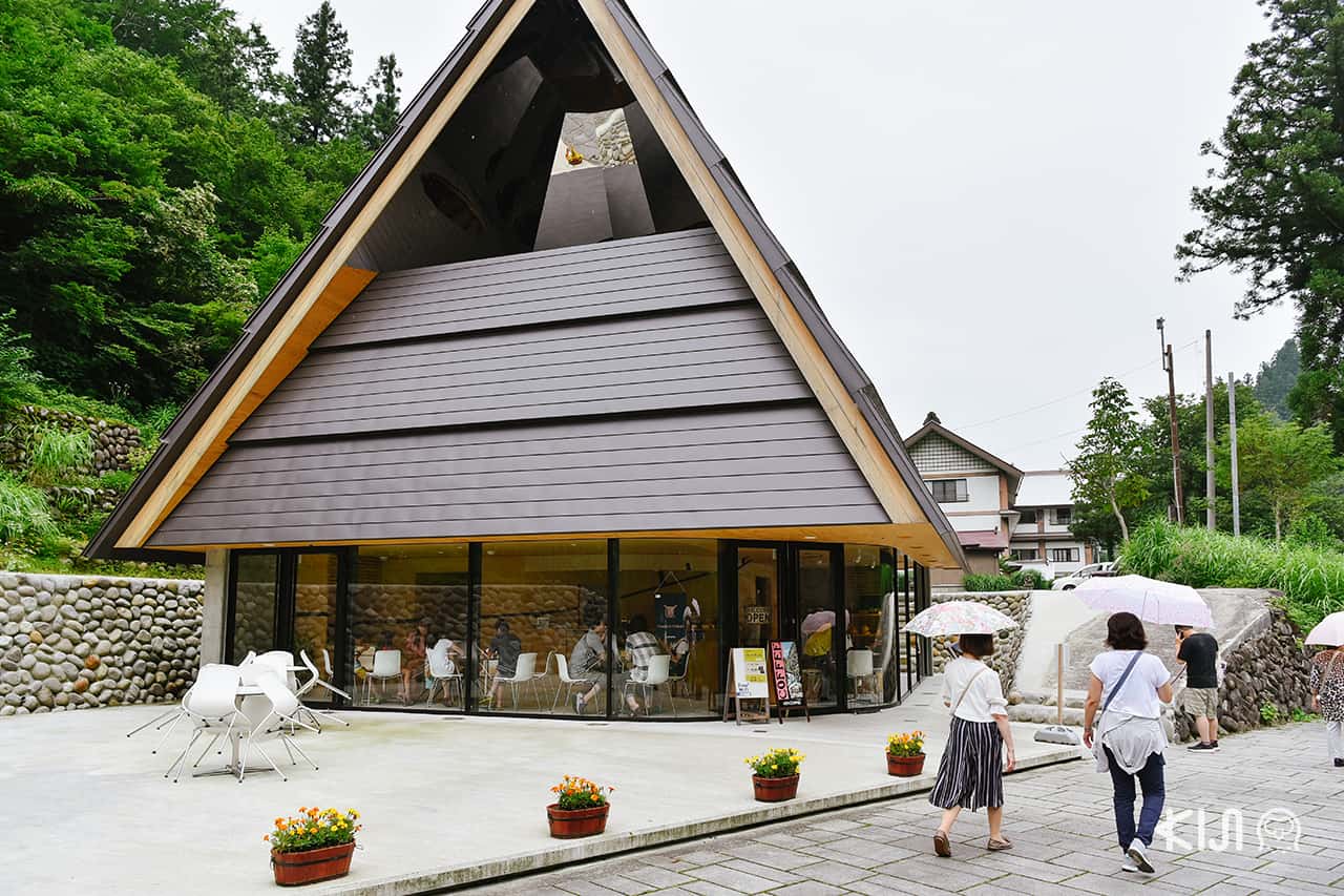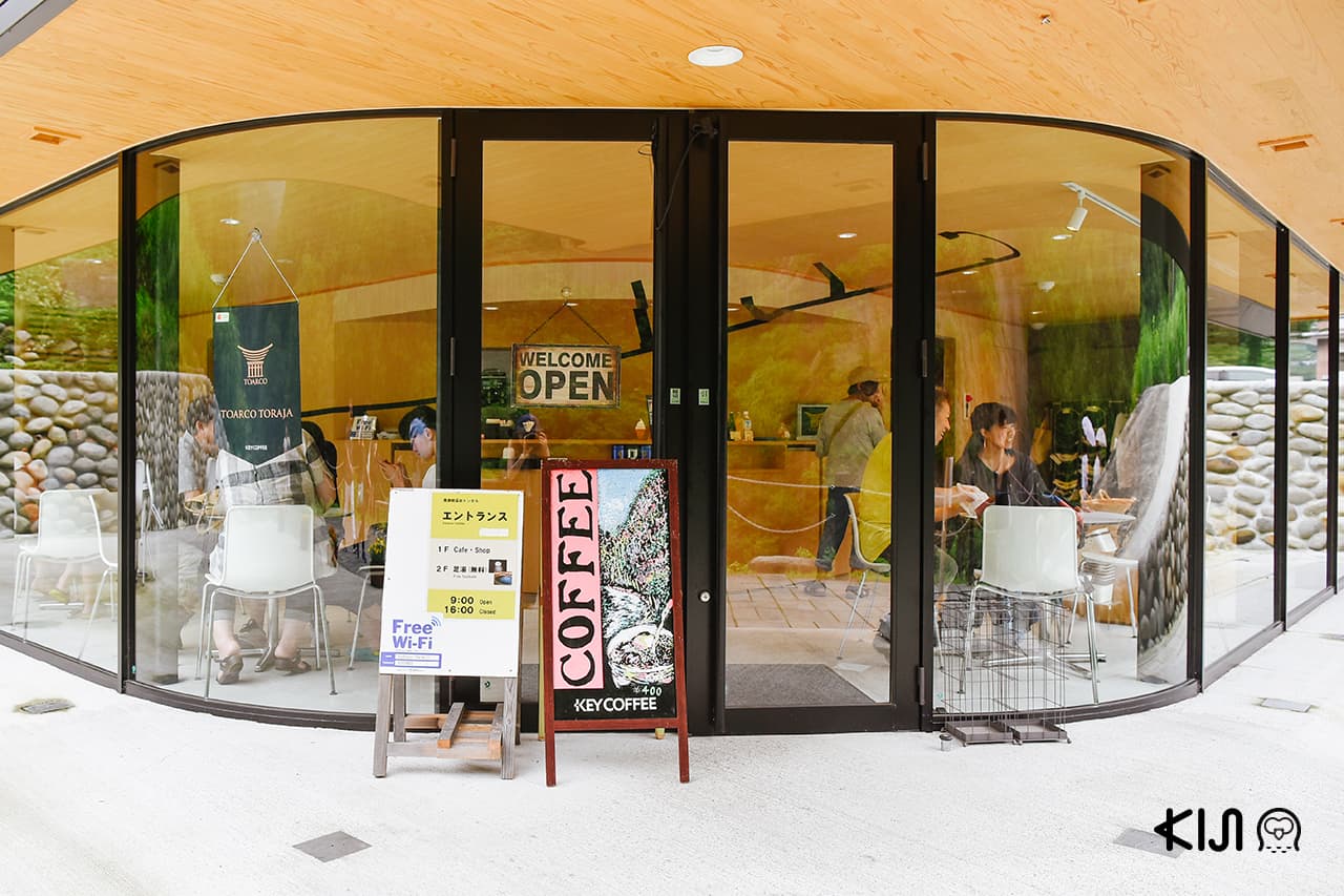 ก่อนกลับอยากแนะนำให้แวะคาเฟ่และร้านขายของที่ระลึกด้านหน้าทางเข้าสักพัก นั่งจิบกาแฟในอาคารเล็กๆ ด้วยคอนเซ็ปต์ที่มีชื่อว่า “Periscope” (ไม้) บรรยากาศไม้สีอ่อนที่ออกแบบโดยสถาปนิกเอง หรือจะขึ้นไปแช่ออนเซ็นเท้า (ฟรี) ที่ชั้น 2 เพื่อผ่อนคลายความเมื่อยล้าจากการเดิน และผ่อนคลายสายตาด้วยงานดีไซน์ขณะแช่เท้าก็ได้เช่นกัน