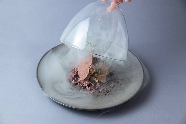 เมนูแรกที่หยิบมาแนะนำเป็นตัวซิกเนเจอร์ของทางร้าน คือ “ช็อกโกแลตกับควัน” ในราคา 1,600 เยน เป็นเมนูดาร์กช็อกโกแลตคุณภาพดี ตัวนูกัต (ตังเม) หอมกรุ่น และโรยด้วยเกร็ดจากดาร์กช็อกโกแลต มาพร้อมกับหมอกควันเย็นๆ ส่งกลิ่นหอมชวนให้ดูลึกลับ เมื่อเปิดฝาครอบกลิ่นหอมของควันที่เข้มข้นก็กระจายออกมาทำให้รู้สึกสดชื่น
