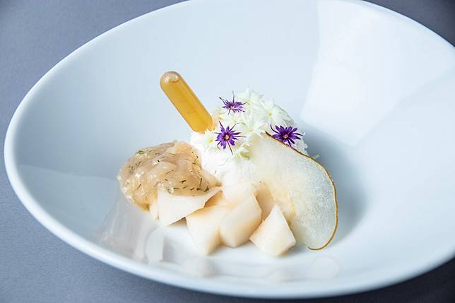 อีกเมนูที่ครีเอตไม่แพ้กันก็คือ “ลูกแพร์ ยูซุ และผักชีลาว” ในราคา 1,650 เยน เพลิดเพลินไปกับรสชาติที่สดชื่นของลูกแพร์ตามฤดูกาล ไอศกรีมรสยูซุพร้อมกับครีมซอสผสมลูกแพร์กับผักชีฝรั่งเสริมด้วยซอสดอกมะลิ
