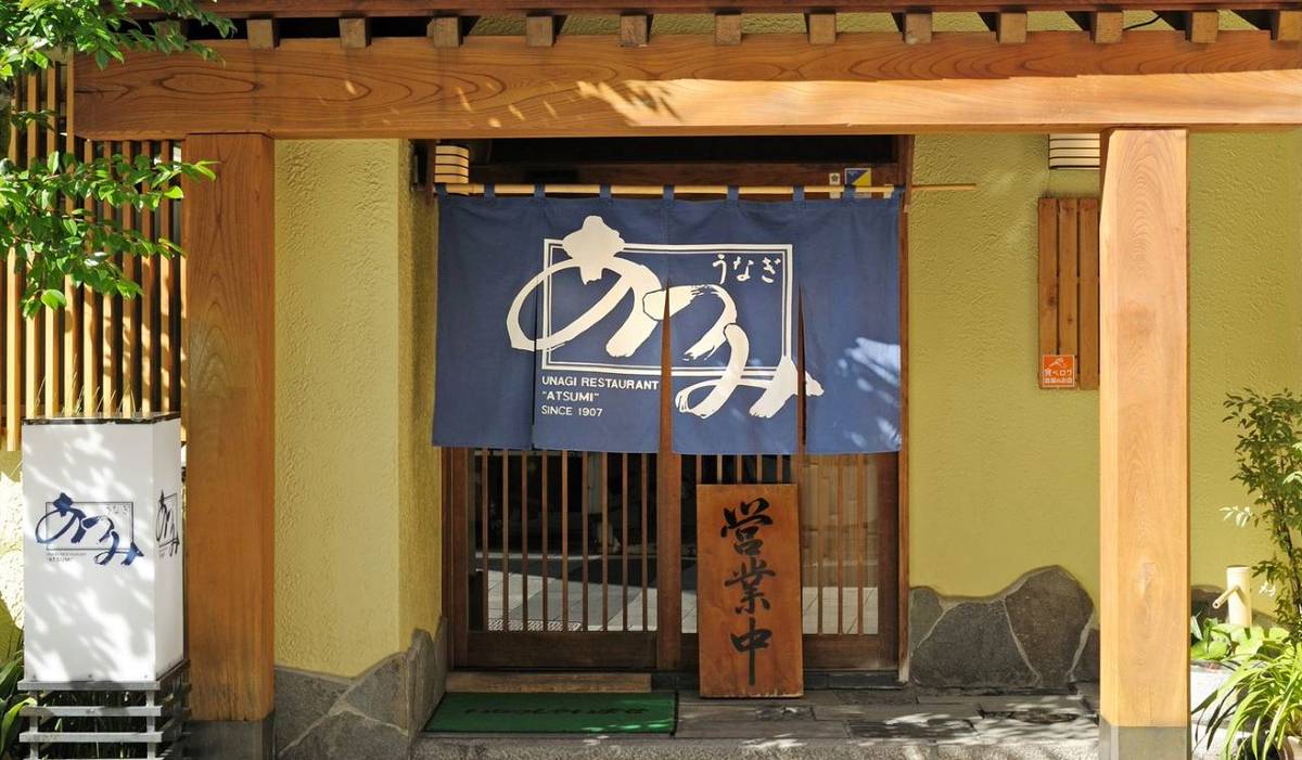 แล้วก็มาถึงร้านสุดท้ายที่จะอยากจะแนะนำให้รู้จักนั่นก็คือ Unagi Atsumi ร้านปลาไหลญี่ปุ่นร้านดังอีกร้านหนึ่งของเมืองฮามามัตสึ ที่ก่อตั้งมานานตั้งปีเมจิที่ 40 (ค.ศ. 1907) ซึ่งหน้าร้านก็ตกแต่งตามแบบฉบับของสไตล์ญี่ปุ่นสมัยก่อนพร้อมกับม่านโนเร็นสีน้ำเงินที่พิมพ์อักษรชื่อร้านเอาไว้ขนาดใหญ่ทำให้สังเกตเห็นได้อย่างชัดเจนเมื่อผ่านมาทางนี้