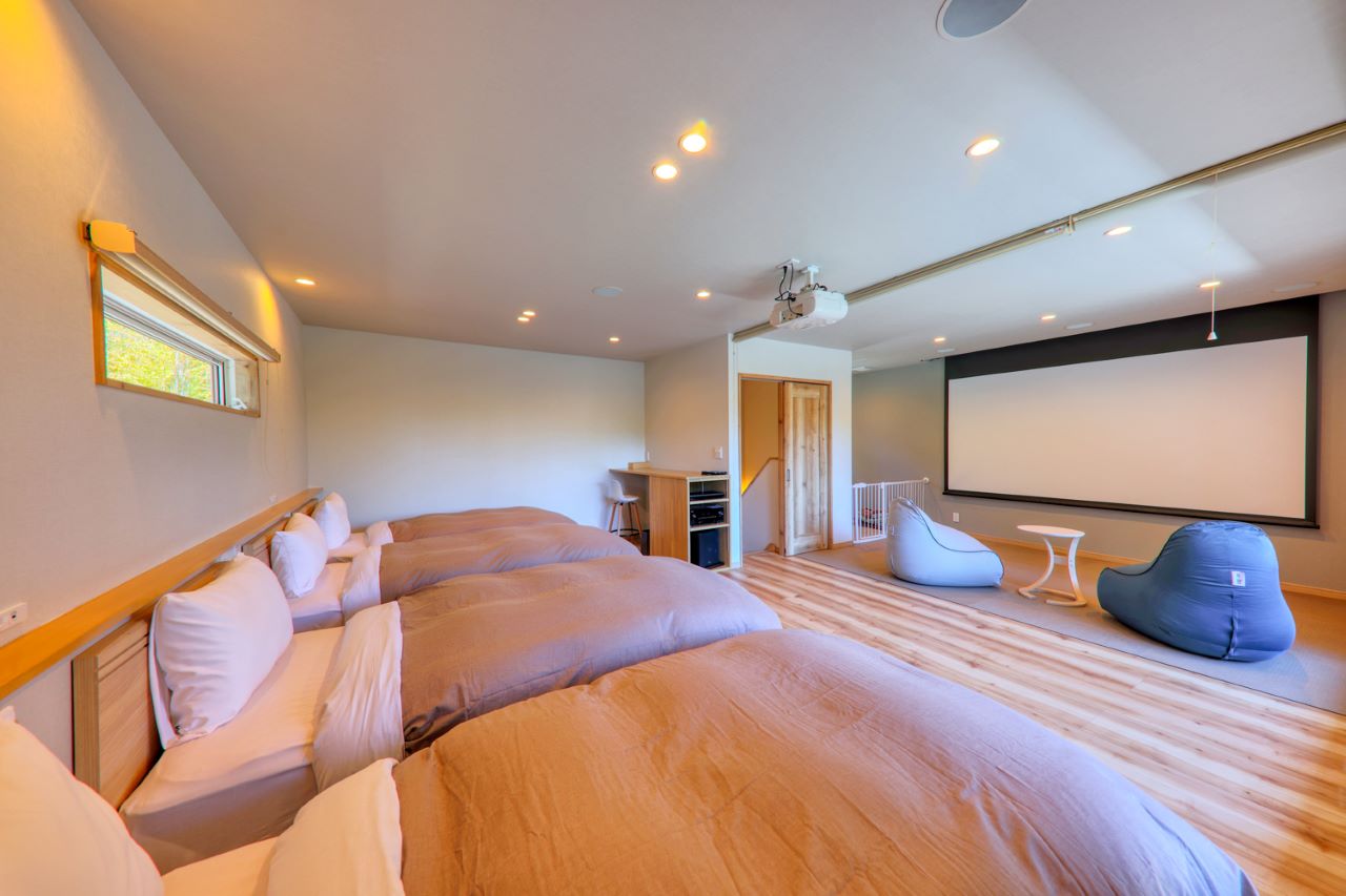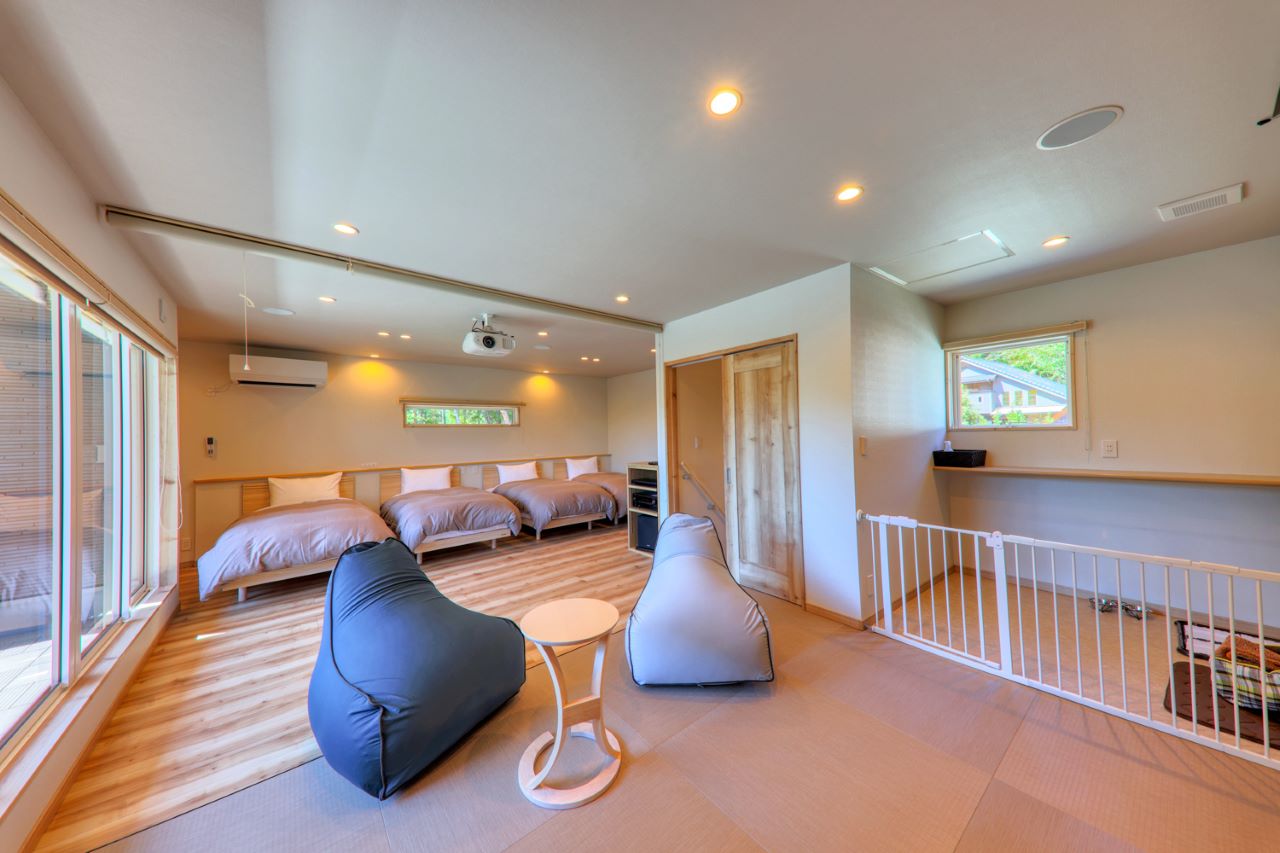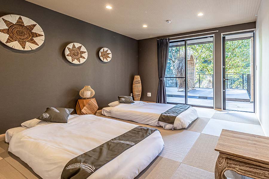 ห้องนอนแต่ละห้องแบ่งออกเป็นสไตล์ตะวันตกและสไตล์ญี่ปุ่น โดยห้องสไตล์ญี่ปุ่นจะจัดเตรียมที่นอนไว้ให้พร้อมโต๊ะตัวเล็กๆ และหากใครห่วงว่าห้องนอนเยอะมากขนาดนี้พื้นที่ในห้องจะแคบหรือเปล่าก็ไม่ต้องกังวลเลย นอกจากภายในจะกว้างขวางแล้ว ทุกห้องยังมีกระจกบานใหญ่ให้แสงธรรมชาติส่องเข้ามาได้อย่างเต็มที่ อีกทั้งอากาศก็ถ่ายเทได้ดีอีกด้วย