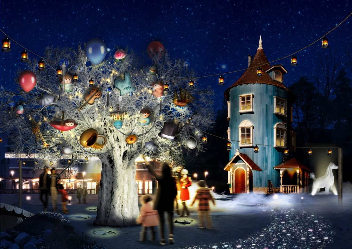 Night Illumination ตื่นตาตื่นใจไปกับการจัดแสดงไฟแสงสีต่างๆ ที่ได้แรงบันดาลใจมาจากเรื่องราวในหนังสือมูมิน ตอน มูมินกลางฤดูหนาว ด้วยโชว์ระยะเวลา 10 นาทีโดยใช้ Projection Mapping ซึ่งเป็นการนำแสงเข้ามาแสดงร่วมกับศิลปะต่างๆ รังสรรค์บ้านมูมินให้น่าตื่นเต้นชวนฝันด้วยแสงออโรร่าราวกับอยู่ฟินเเลนด์ เสริมบรรยากาศให้น่าค้นหายิ่งขึ้นด้วย Moomin Valley Winter Tree ความสูง 4 เมตร เมื่อเราเดินผ่านจะได้ยินเสียงทรัมเป็ตและไวโอลินคลอเบาๆ จากต้นไม้