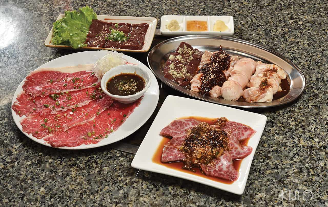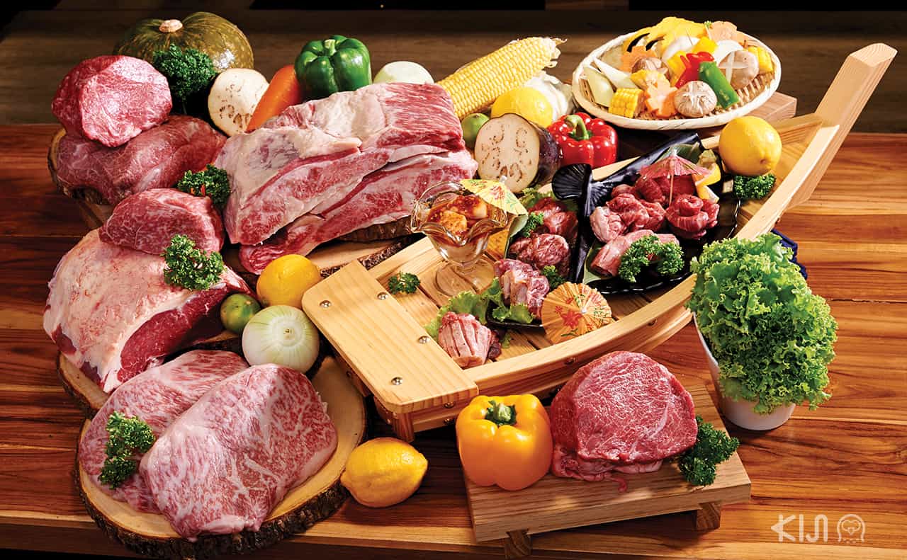 เมนูบุฟเฟ่ต์แบ่งออกเป็นคอร์สต่างๆ เช่น Irodori ที่เห็นแล้วต้องตะลึงกับชนิดของเนื้อชั้นเลิศกับความสดใหม่ที่ปั๊วะปังเป็นที่สุด ไม่ว่าจะเป็นเมนูใหม่อย่างวากิวยุกเกะและชีสทัคคาลบี้ หรือจะเป็นคอร์ส Zeitaku ที่มีเมนูฟู่ฟ่าอย่าง Azuma Wagyu เกรด A4-A5 ริบอาย เซอร์ลอยด์ เนื้อซี่โครงติดกระดูก สเต๊กลิ้นวัว ฯลฯ สามารถเลือกกินแค่ส่วนที่ชอบได้ไม่อั้น ราวกับสวรรค์ของคนรักการกินเนื้อจริงๆ ส่วนข้าวสวยที่ส่องแสงระยิบระยับของร้านนี้แน่นอนว่าเป็นข้าวจากญี่ปุ่นแท้ๆ นอกจากนี้ก็ยังมีเมนูกินเล่นอีกหลายอย่าง เรียกได้ว่าอิ่มทั้งใจทั้งพุงไปเลย