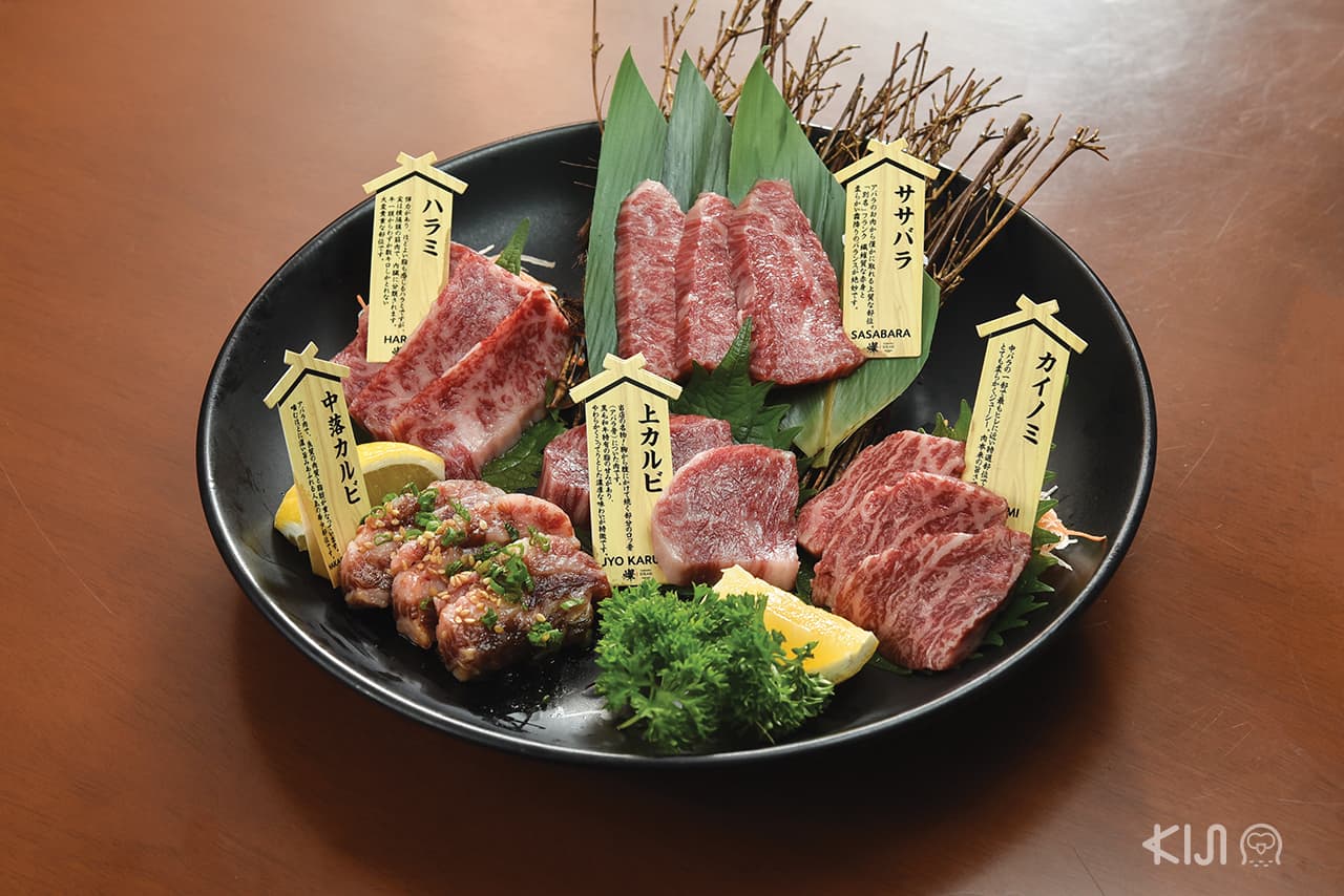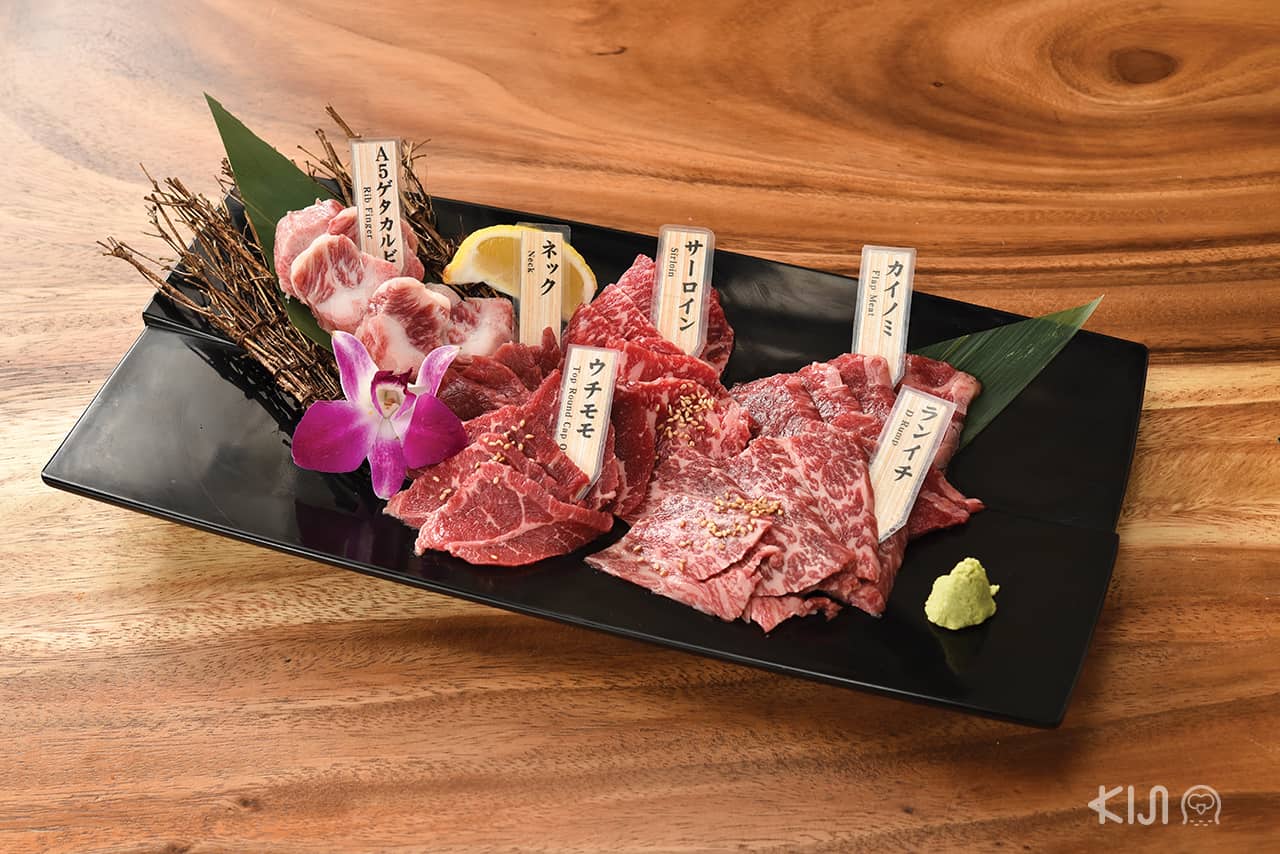 แต่ละจานที่เสิร์ฟมาบนโต๊ะ เรียงรายไปด้วยชิ้นเนื้อที่แล่มาในระดับความหนาที่พอเหมาะ ความอร่อยล้นปรี่แทบจะแทรกออกมาจากริ้วลายของเนื้อติดมัน เมื่อใช้ฟันบดเคี้ยว น้ำที่แฝงอยู่ในชั้นเนื้อก็ซึมออกมาสู่ลิ้น พุ่งตรงไปยังประสาทในการรับรสอร่อย เมนูวากิวแบบคอร์ส 3 แบบ (ราคาเริ่มต้น 1,200 บาท) มีเฉพาะที่สาขาซอย 23 รวมเครื่องดื่มไม่อั้น ที่นั่งทั้งหมดเป็นแบบห้องส่วนตัว จึงเหมาะกับคนที่อยากนั่งคุยแบบเป็นส่วนตัวหรือกินดื่มได้โดยไม่ต้องสงวนท่าที