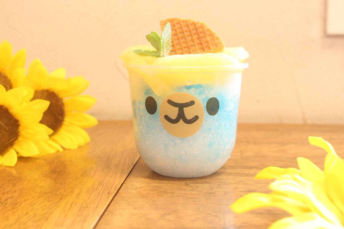 อากาศร้อนๆ ก็ต้องดับร้อนด้วยน้ำแข็งไสเย็นๆ รสบลูฮาวายที่ใส่ท็อปปิ้งมากมายทั้งวาฟเฟิล ไอศกรีม สับปะรด รวมกันในแก้วอัลปากาน่ารักๆ ที่ให้ความรู้สึกเย็นสดชื่น มองดูแล้วก็รู้สึกเหมือนดอกทานตะวันบานสะพรั่งข้างอัลปากาอย่างไรอย่างนั้น ราคาเพียง 450 เยน (รวมภาษี)